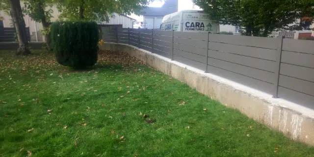 Pose par Cara Fermetures d’une clôture de muret ajourée (modèle Maez) sur-mesure en aluminium de chez Cadiou à Vignoc, au nord ouest de Rennes.